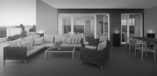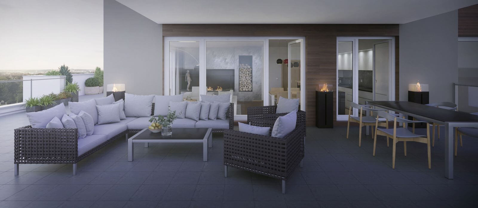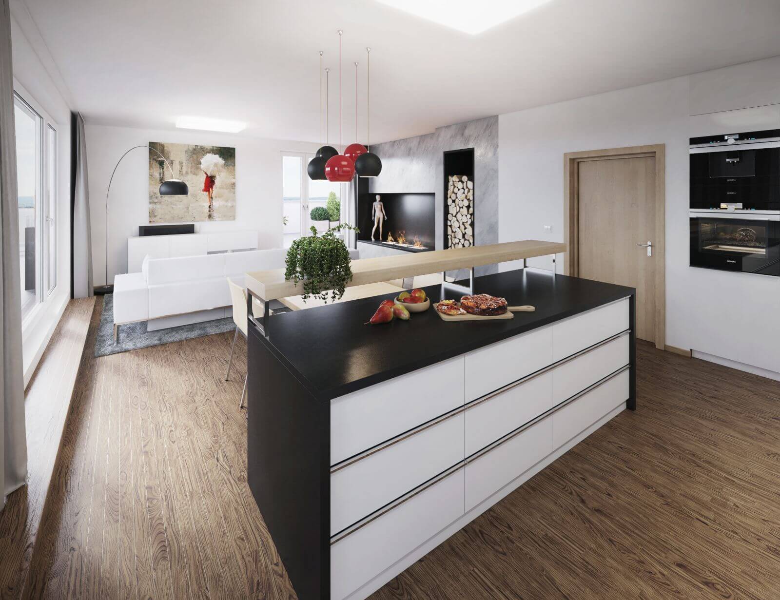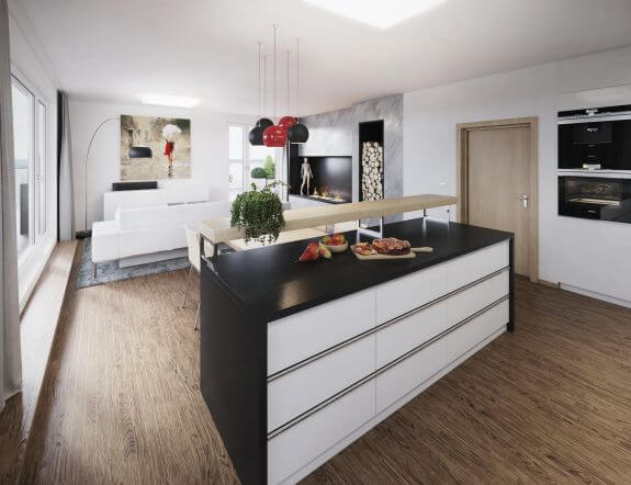 Otevřený obývací prostor je rozčleněn do tří logických částí – na kuchyňský kout, částečně oddělený středovým ostrůvkem, na něj navazující jídelní stůl a na klidovou část, kterou odděluje sedací souprava. Celá místnost se otevírá na velkou terasu, která umožňuje přenést rodinné dění ven. Atmosféru zpříjemňuje elektrický krb na stěně obýváku a plynové hořáky na terase, které umožňují využívat terasu po delší část roku.