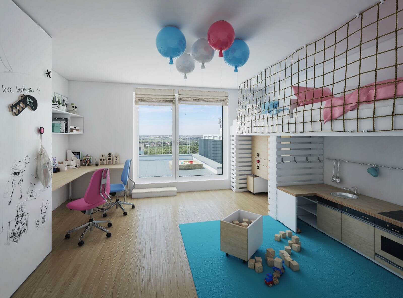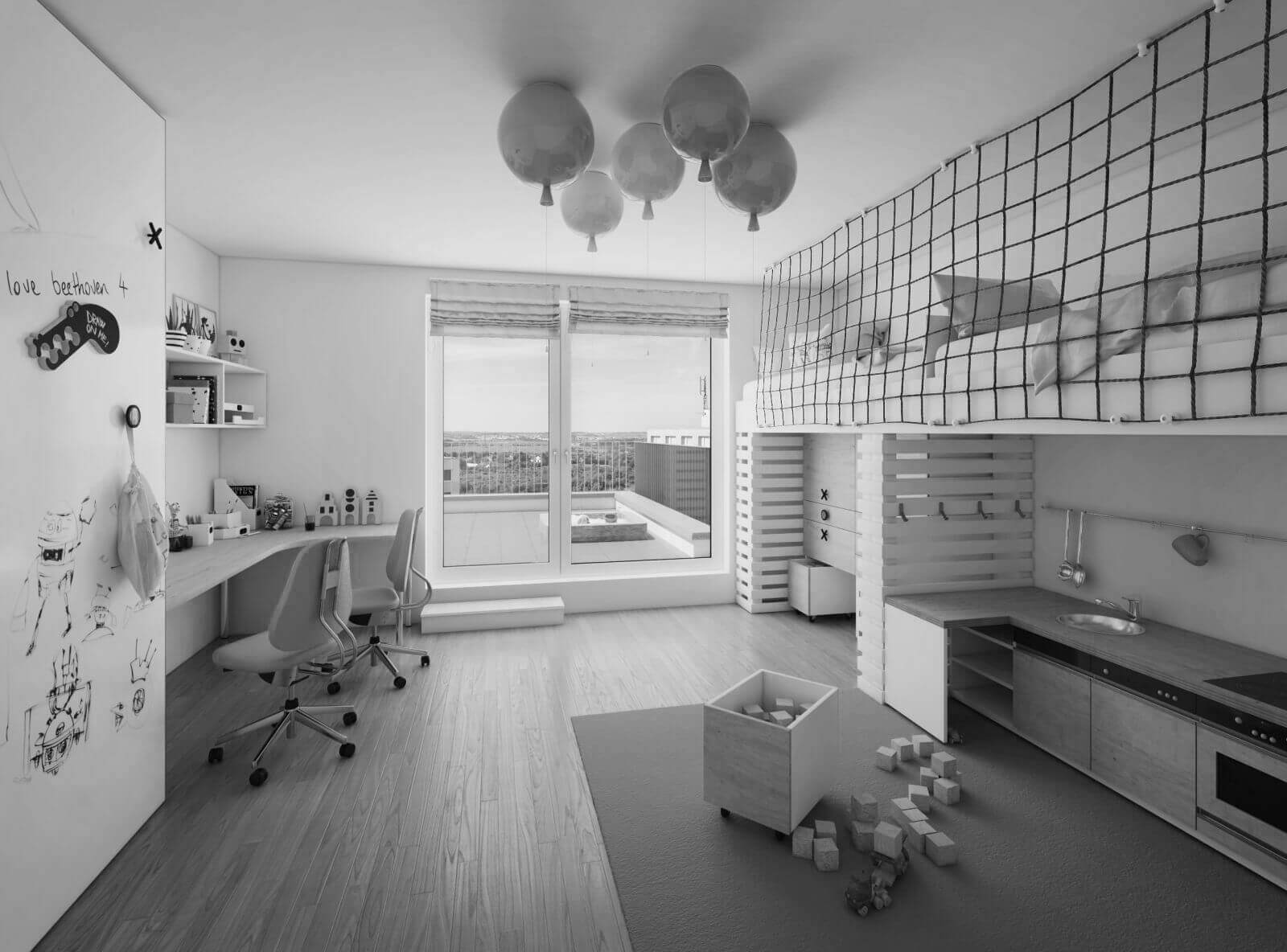 V dětském pokoji pro dvě děti jsme chtěli ponechat co nejvíce prostoru na hraní, proto jsou obě postele umístěné na vestavěném patře. Členěný prostor poskytuje nejen spoustu místa, ale i důležitý pocit soukromí. Nábytek je na míru, včetně dětské kuchyňky a úložných skříní. Ty mají funkční dveře, na které lze psát a věšet různé pomůcky.