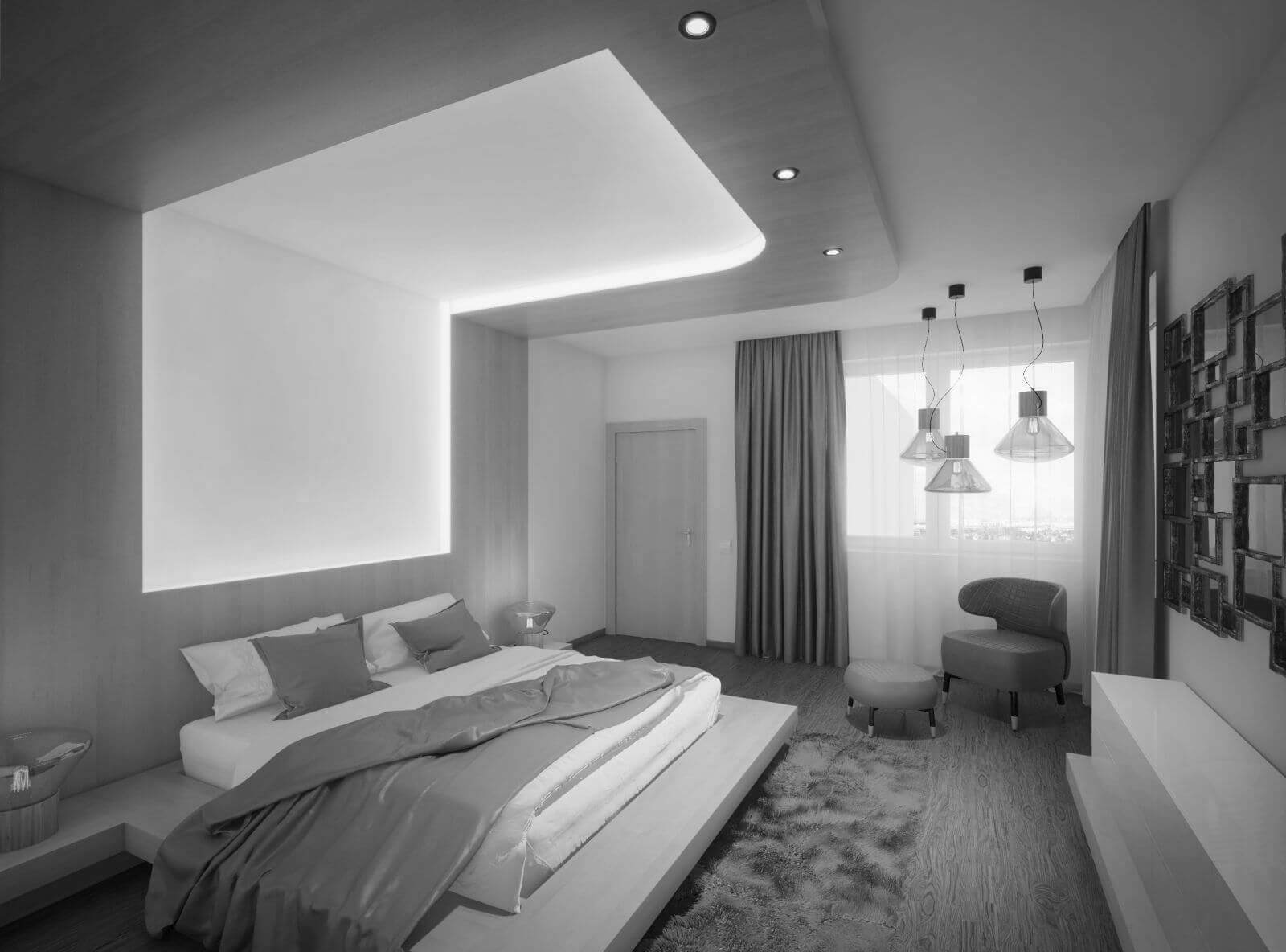Ložnice slouží nejen na spaní ale i k uloupení chvíle soukromí mimo společné dění. U okna je proto umístěný koutek na čtení s pohodlným sezením a samostatným osvětlením. Dominantou ložnice je postel, zdůrazněná nebesy, která ohraničují spací prostor a s pomocí náladového podsvícení vytváří jedinečnou intimní atmosféru. Velká šatní skříň je krytá zrcadlem, které zvětšuje prostor.